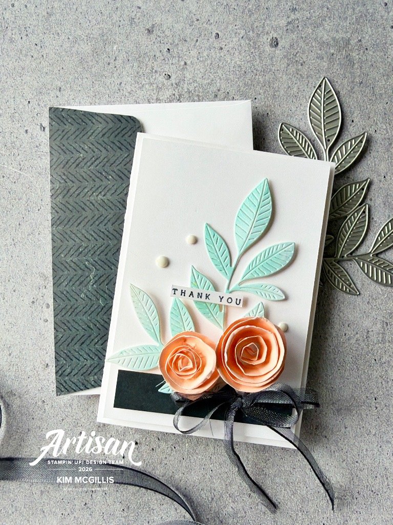 For the foliage, I die-cut the leaf images and then gently blended Shy Shamrock ink over them to give a more natural, shaded look. This small step really brings the greenery to life and ties in beautifully with the color palette.