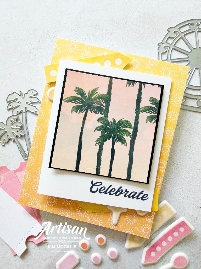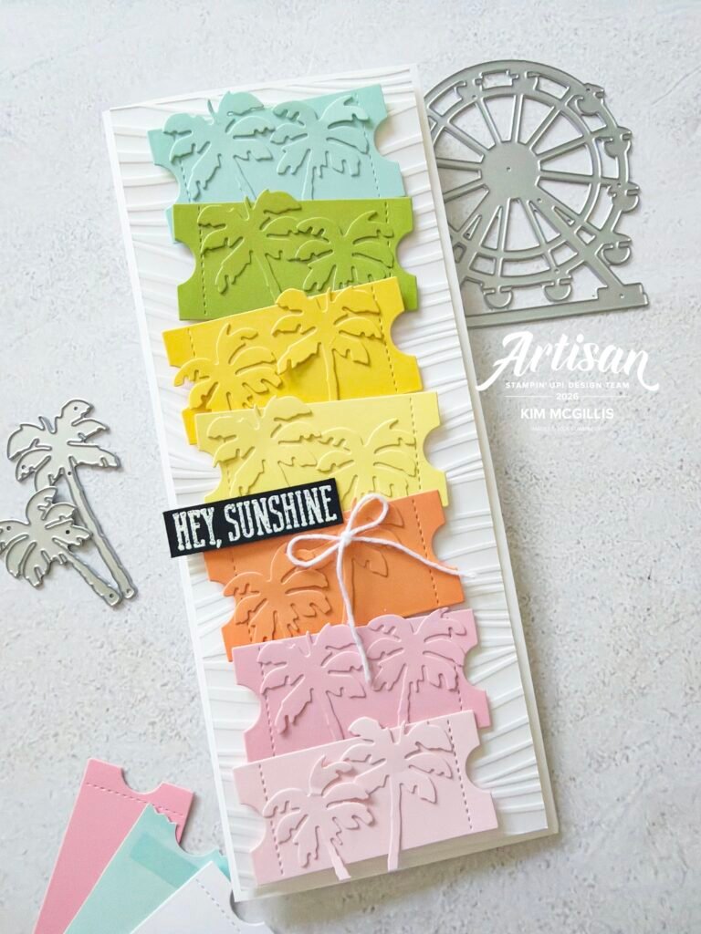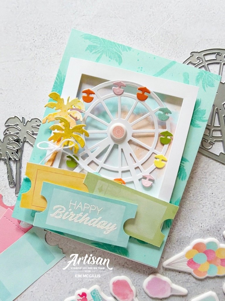 To bring in those classic boardwalk vibes, I added die-cut palm trees and tickets from the Boardwalk Fun Dies, creating a fun, summery scene full of personality.