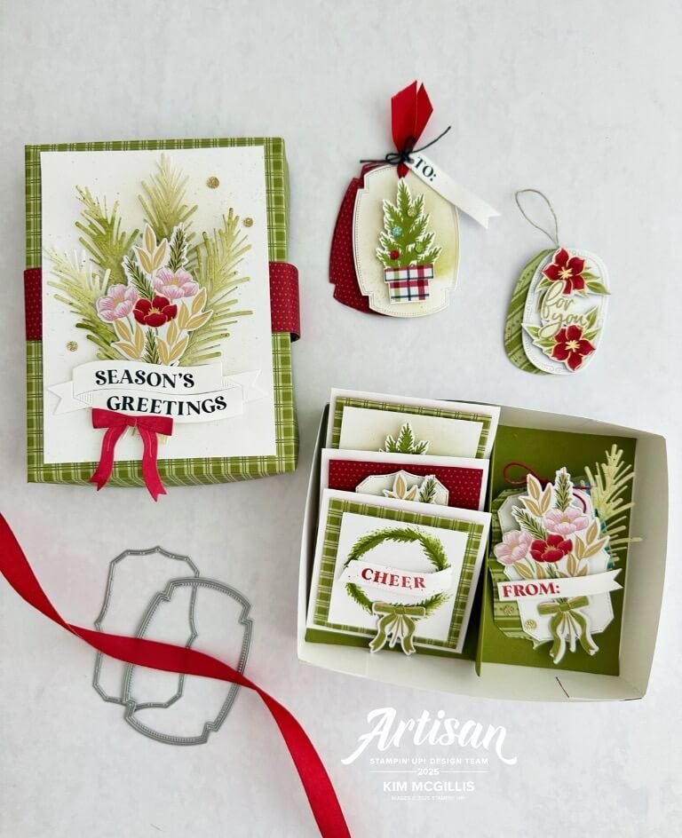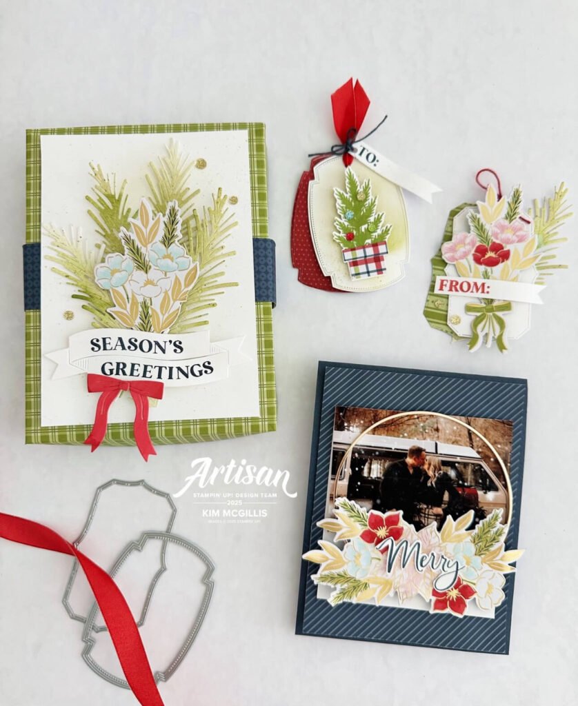 I made a mini card and tag box, shared different ways to use the stamps and also made a personalized photo greeting card for the upcoming season.