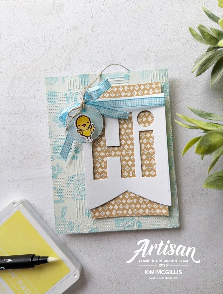 By pairing the embossed Designer Series Paper with a custom die-cut banner, this project moves beautifully into everyday spring cards, birthdays, or just-because notes.